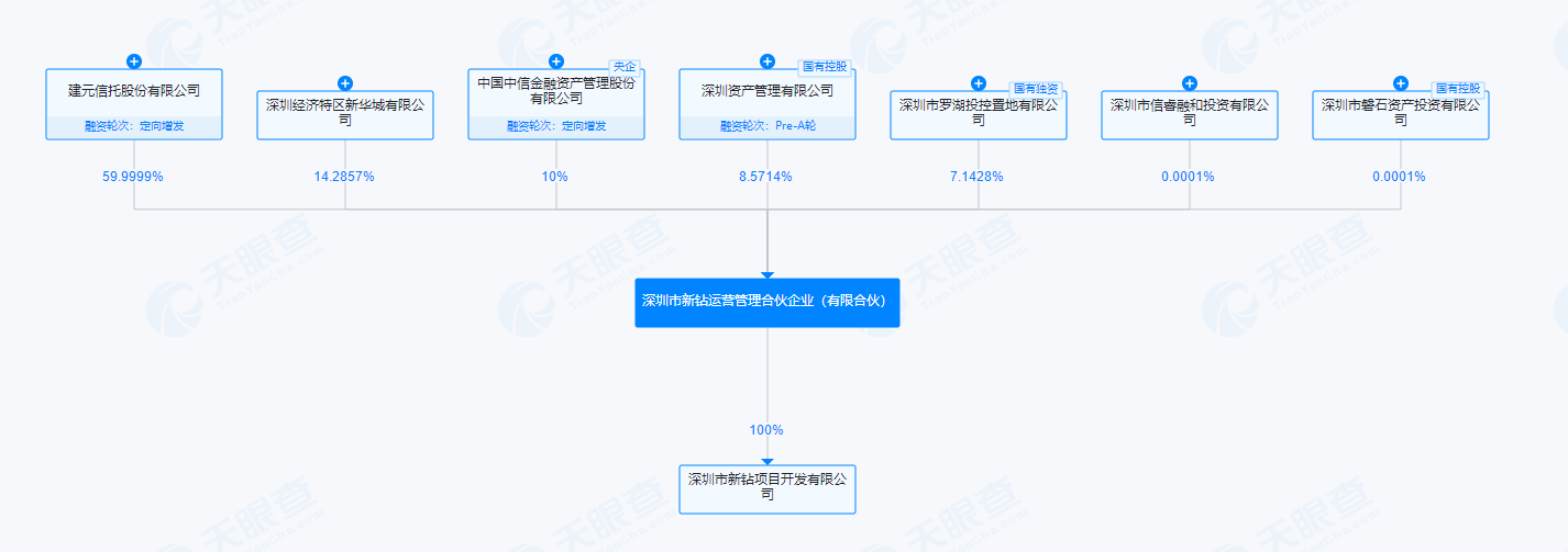 天眼查发现,深圳市新钻项目开发有限公司由深圳市新钻运营管理合伙企业(有限合伙)100%控股,其中,建元信托持有59.9999%股权,新华城持股约14.286%,中信金融资管、深圳资管、罗湖投控置地分别持股约10%、8.575及7.14%。