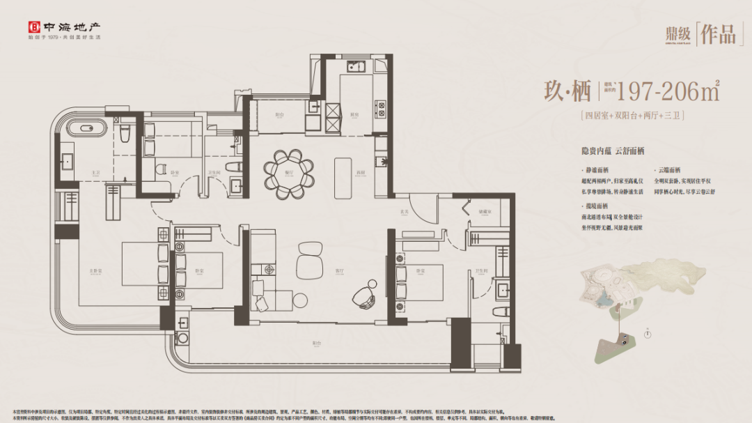 户型设计也有惊喜,其强调"全景舱"视野,建面约282m²户型采用270°无边角厅与群岛阳台设计,最大化景观视野;主力197m²-206m²四居室采用双全景舱布局,保障居住舒适度与视野平权。