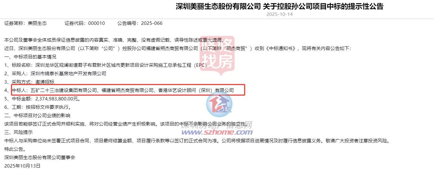 此次项目中标方——五矿二十三冶建设集团有限公司与深圳美丽生态股份有限公司均已发布相关公告。