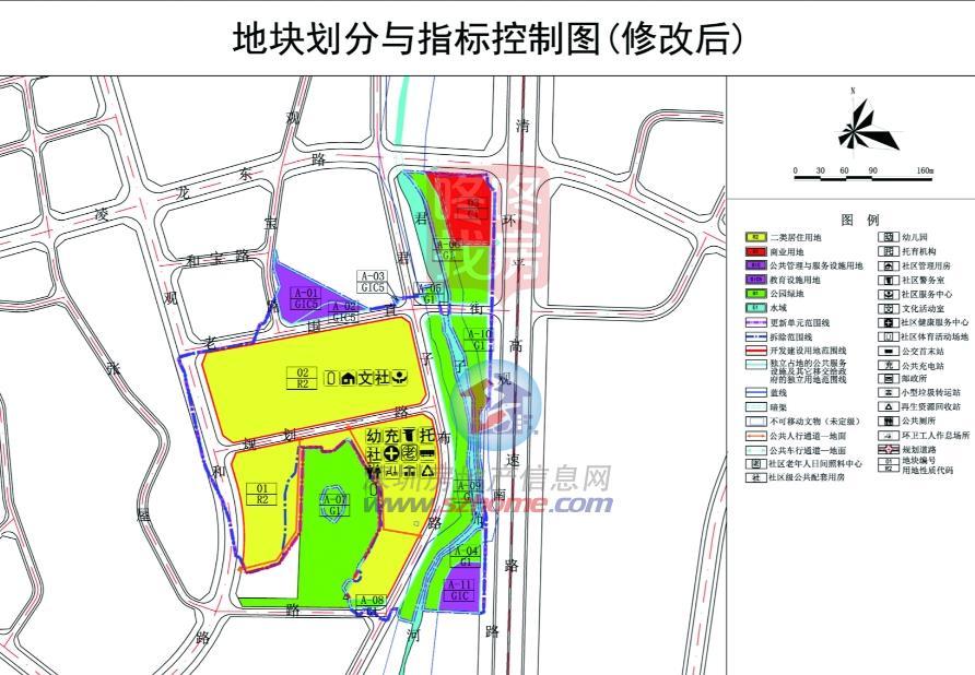 该工程用地包括3个地块,其中:01地块,用地性质:二类居住用地,规划容积率6.0,用地面积24465.3 平方米;02地块,二类居住用地,规划容积率5.6,用地面积25763平方米;03地块,商业用地,规划容积率7.2,用地面积4694.1平方米;其余A-01~A-11地块分别为教育设施用地以及公园绿地。