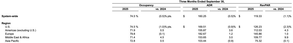 在住宿行业指标方面,2025年第三季度,希尔顿全系统范围内的酒店入住率为74.5%,同比减少0.5个百分点;ADR(平均每日房价)为160.25美元,同比减少0.5%;RevPAR(平均每间可出租客房收入)为119.33美元,同比减少1.1%。