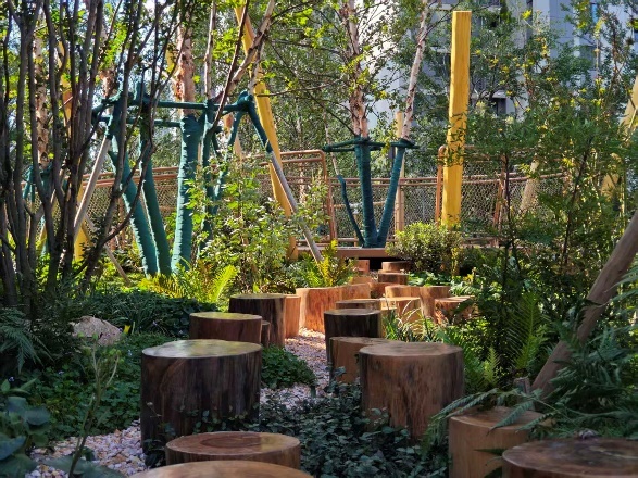 作为本次交付的最大亮点之一,“森野拾趣”儿童活动区的落地,完美诠释了朗拾雨核“让小朋友在自然中生长、奔跑”的育儿理念。该区域突破传统儿童乐园的设计框架,强调与自然环境的深度融合。通过巧妙运用地形、林木与游乐设施,为孩子们打造了一个探索、攀爬、嬉戏的天然乐园。在这里,童年不再是电子屏幕的方寸之间,而是回归本真,在阳光、泥土与绿叶的陪伴下,激发无限想象力与生命力,实现身心的自然成长。