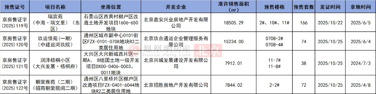 10月20日至10月26日,北京4盘取得预售证,分别为中海·瑞文里(东区)、中建运河玖院、大兴发展·梧桐府以及招商朝棠揽阅二期,涉及350套房源,准许销售总面积约49495.32㎡。