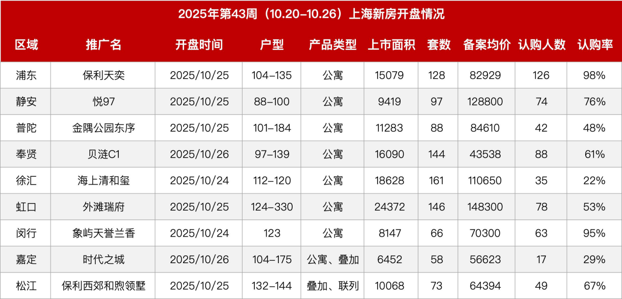 供应端方面,上周共有保利天奕、悦97、金隅公园东序、贝涟C1、海上清和玺、外滩瑞府、象屿天誉兰香、时代之城、保利西郊和煦领墅9个项目开盘,累计推出961套房源,无日光盘出现。
