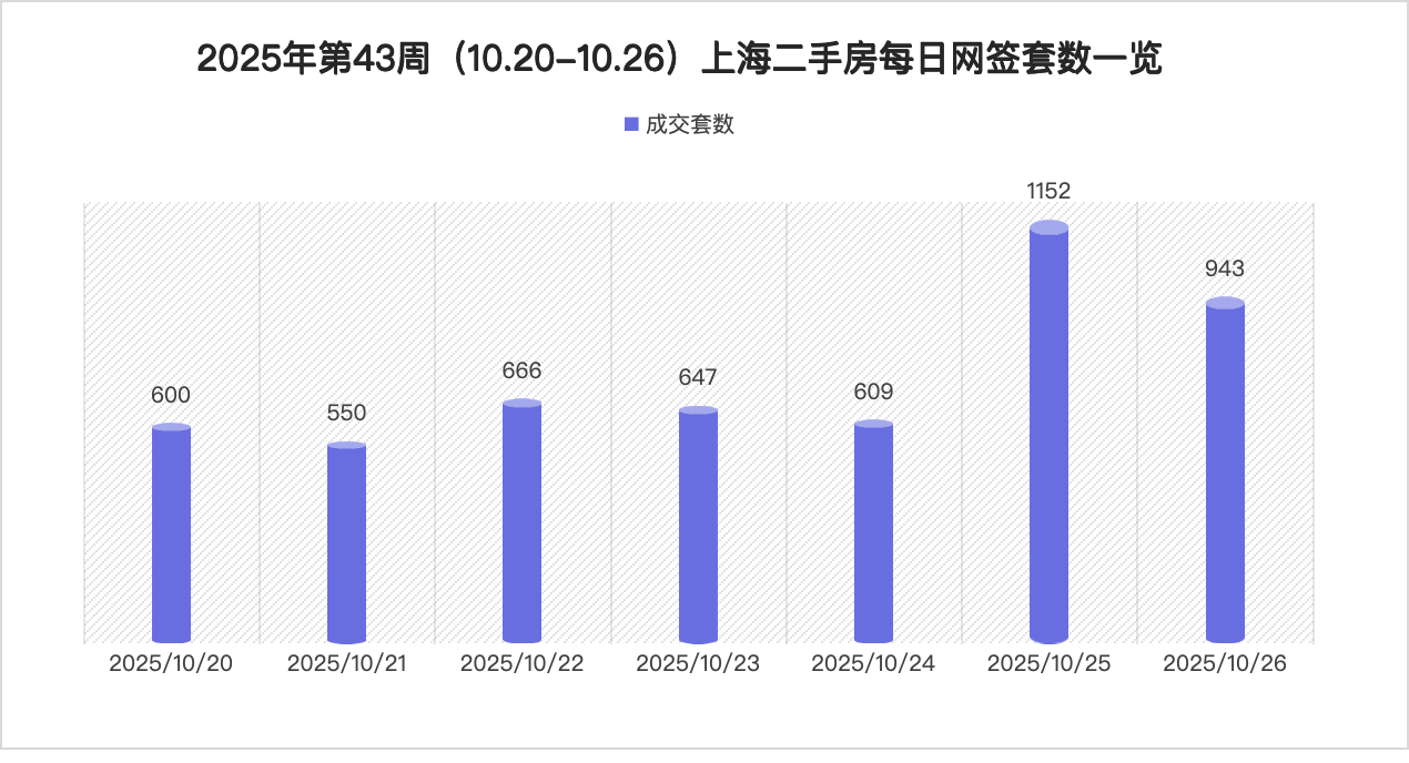 统计周期内,上海二手房网签总量为5167套,日均成交738套。值得注意的是,10月25日单日成交量再次突破千套,达1152套,显示出部分购房需求在价格调整窗口期择机入市。