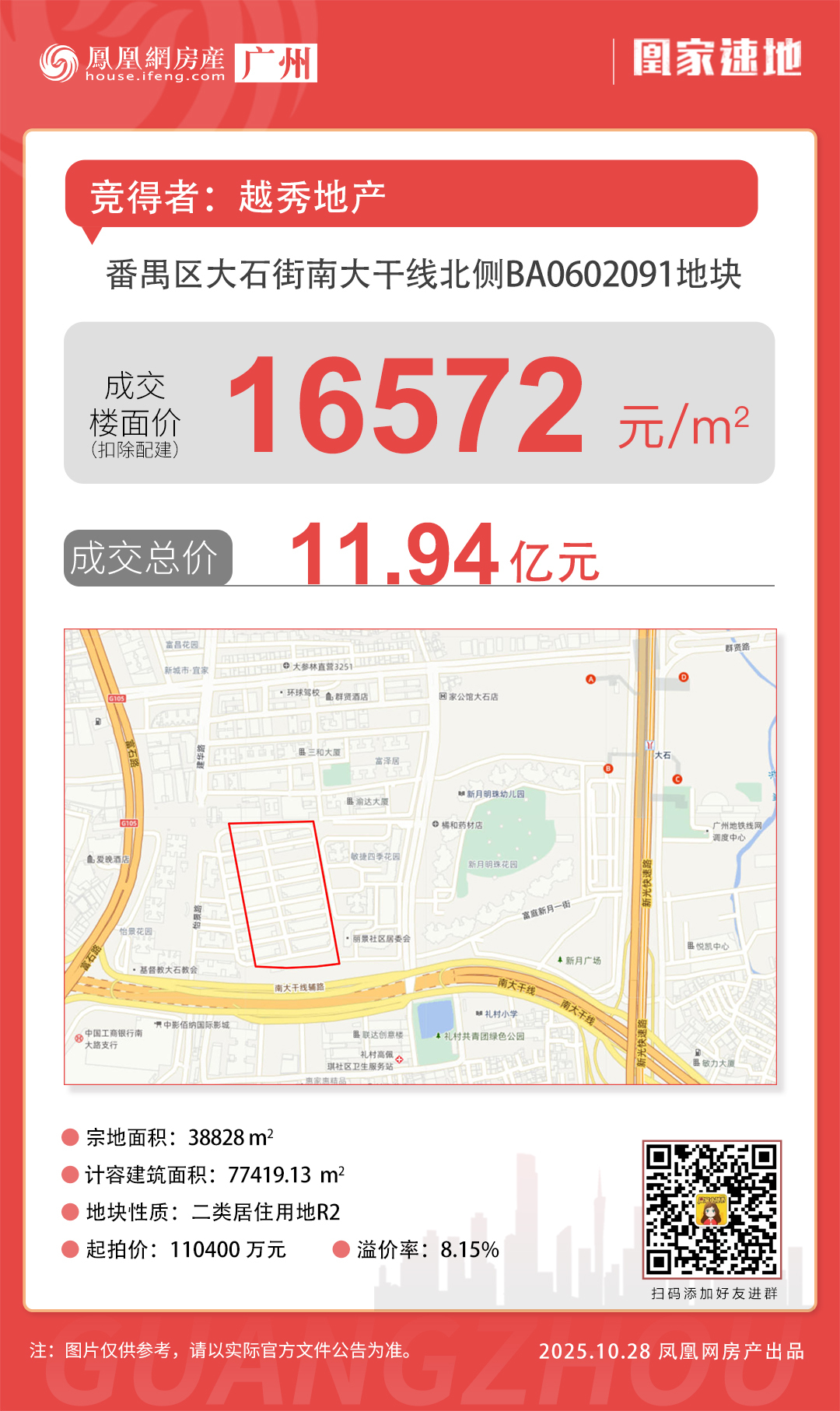 10月28日10时,番禺区大石街南大干线北侧BA0602091地块进行限时竞拍,经过18轮竞价,由广州新越房地产开发有限公司,归属越秀地产,以总价11.94亿元竞得,溢价8.15%。扣除配建后,折合楼面价为16572元/平。