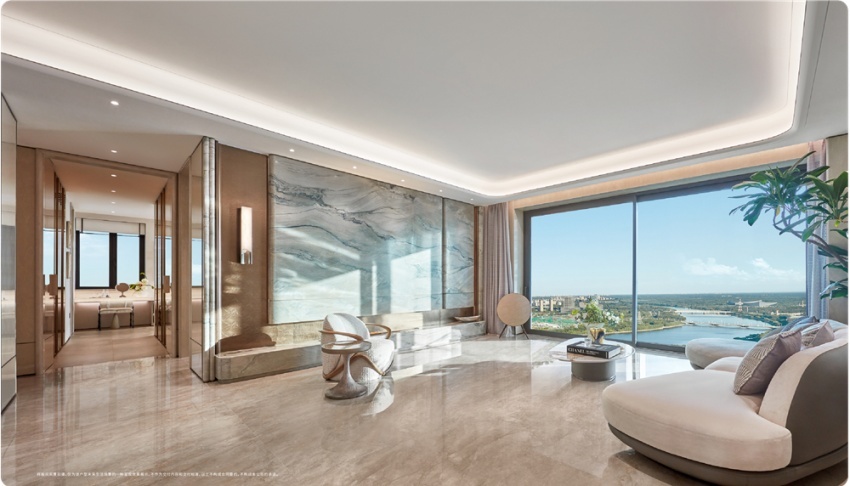 酒店式主卧套房以近60㎡的超级尺度,将"永恒的盛筵"升华至全新境界。 这里不仅是休憩的场所,更是一座悬浮于运河上空的私人观景台,一处让天地入怀的精神栖居。