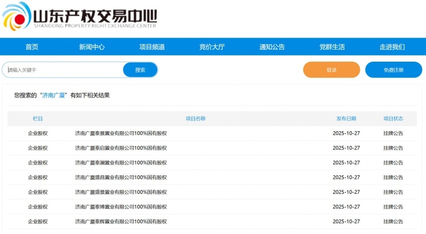 近日,凤凰网房产从山东产权交易中心获悉,济南轨道交通集团旗下山东广厦三维地产有限公司一次性挂牌转让7家地产公司100%股权,每家公司的转让底价均为1元,挂牌起止日期为2025年10月27日至2025年11月21日。