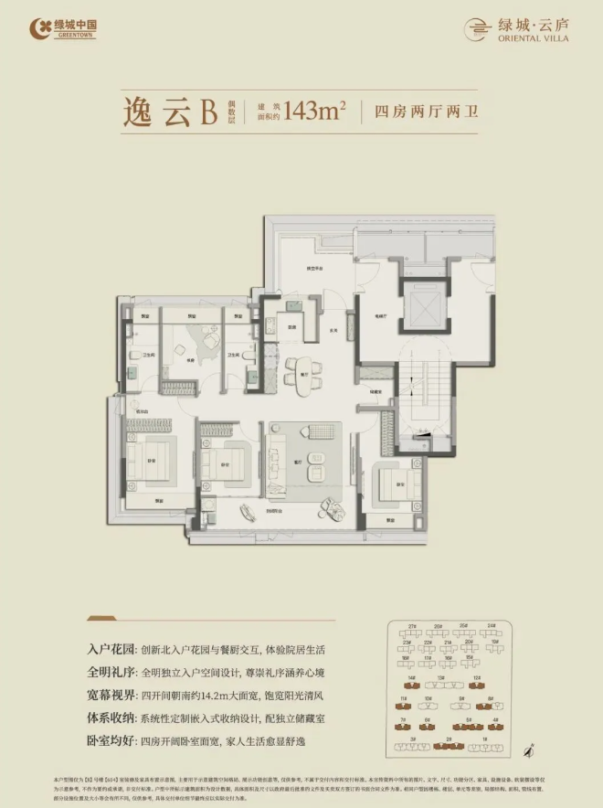 上城十号院一梯一户打造,户型建面约120㎡、130㎡、140㎡,而套内实际使用面积能够达到140-160㎡。