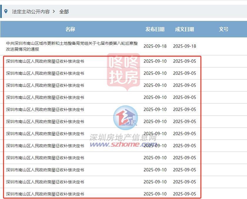 今年9月,南山区政府发布了多份房屋征收补偿决定书,对范围内尚未签约的房屋实施征收,并同步收回相应的国有土地使用权。