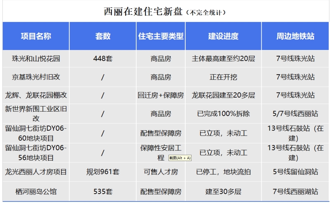 据不完全统计,西丽片区后续仍将有多个项目陆续入市,除商品住宅外,还包括多个配售型保障房及人才住房项目。