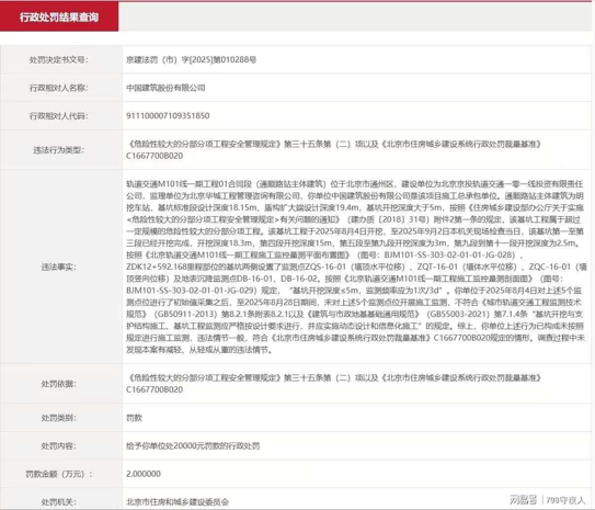 中国建筑因北京地铁M101线施工监测违规被罚款2万元