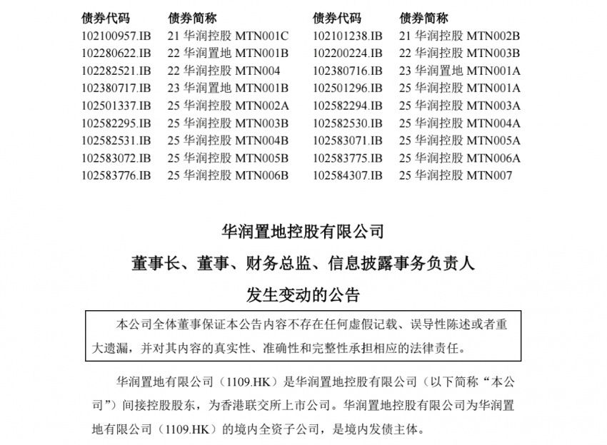凤凰网房产风财讯:10月31日,华润置地控股有限公司发布董事长、董事、财务总监、信息披露事务负责人发生变动的公告。华润置地控股有限公司为上市公司华润置地(1109.HK)的境内全资子公司,是境内发债主体。