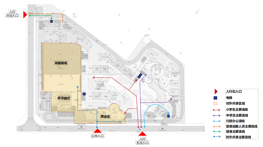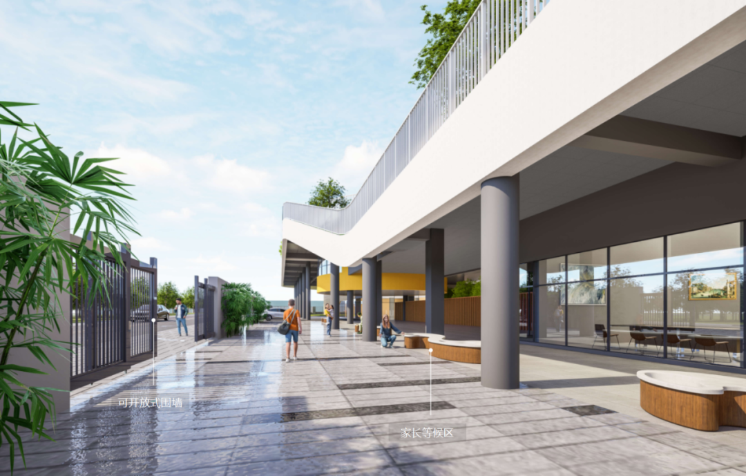校园沿规划二路设计有大空间尺度的入口广场和接送等候区,满足家长等候和接送需求。具有科技特征的入口雨棚设计增强了学校的标识性。同时,在地下室规划了安全高效的车行接送路线,确保校园交通的流畅和安全。