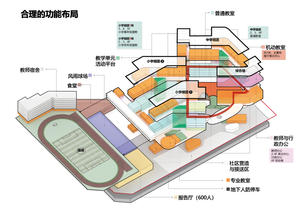 项目主入口设于规划二路上,学生通过入口广场分散到各栋教学楼。教学楼之间通过连廊紧密连接,体育场位于三楼,与教学楼紧密相连。每个教学单元均设有活动平台,方便师生在课间活动。