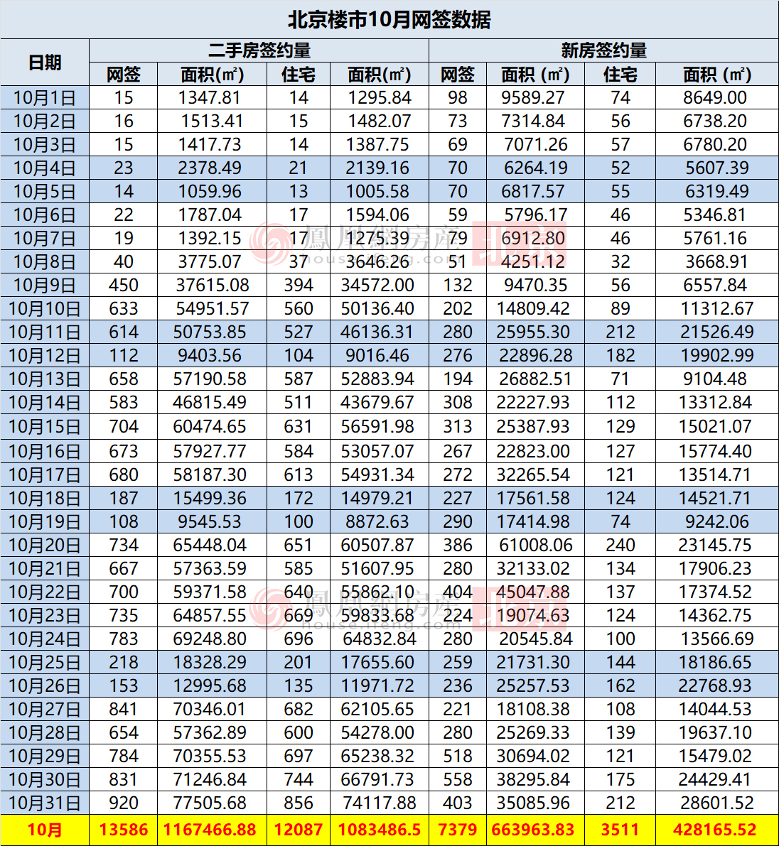 2025年10月第五周北京二手房住宅/二手房网签面积