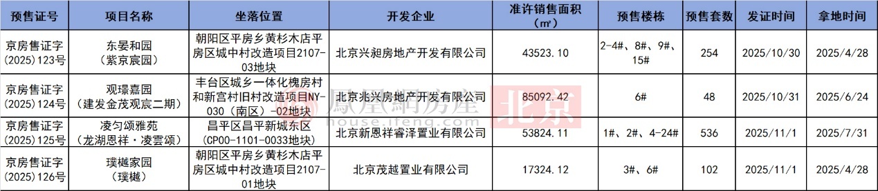 10月27日至11月02日,北京4盘取得预售证,分别为紫京宸园、建发金茂观宸二期、龙湖恩祥·凌雲颂以及璞樾,涉及940套房源,准许销售总面积约199763.75㎡。