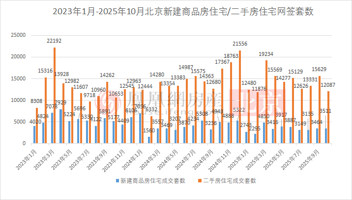 2023年1月-2025年10月北京新建商品房住宅/二手房住宅网签套数