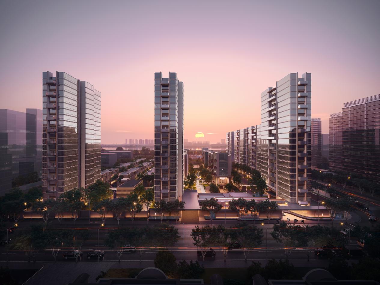 在东侧:地块整体抬高约1米,洋楼区整体抬高约2.2米,结合高层、洋房区首层全架空,搭建一座“静谧高台”,既隔绝城市喧嚣,也让视野最大化。