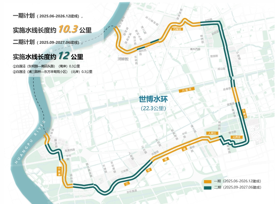 据悉,世博水环项目建设正稳步推进,其中一期工程已正式开工,计划于2026年12月竣工,实施水线长度约10.3公里;二期工程则预计在2025年9月启动建设,2027年6月完成交付。
