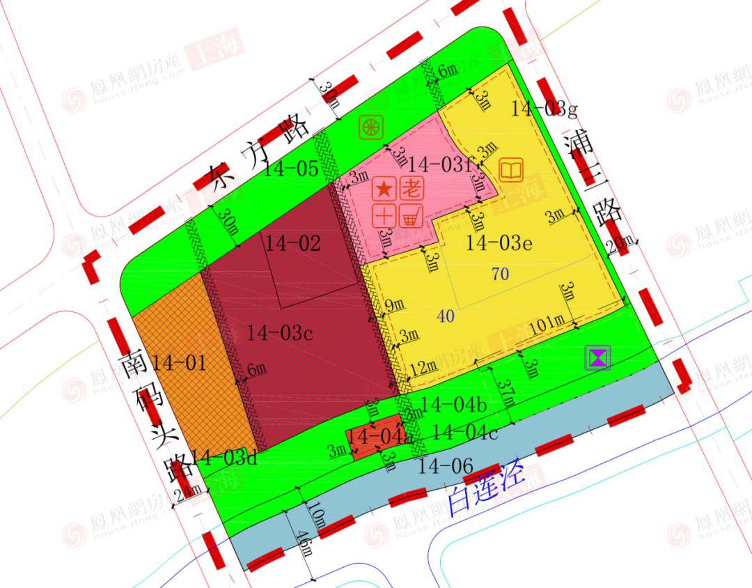从区位条件来看,14-03e地块坐落于东方路与浦三路交叉口,紧邻地铁6号线临沂新村站,步行距离约300 米,属于浦东内中环区域内稀缺的住宅用地。尽管地块周边城市资源能级偏中等,以沿街商业形态为主,但生活氛围十分浓厚,教育、医疗、购物等各类生活配套设施一应俱全。尤为值得关注的是,该地块南侧毗邻白莲泾,正处于规划中的世博水环沿线。