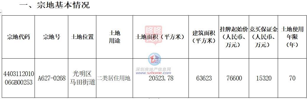 A627-0268宗地位于光明马田街道,土地面积20523.78平方米,建面约6.36万平米,挂牌起始价约7.66亿,土地使用年限约70年。