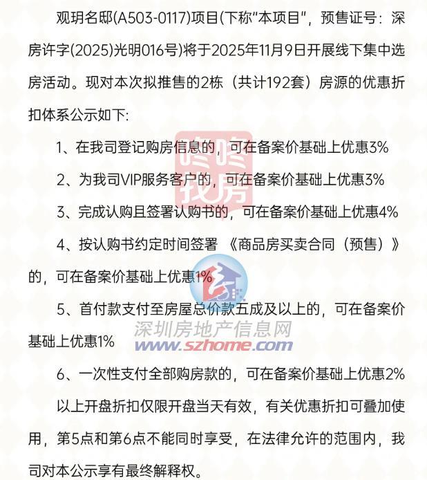 在开盘前的10月31日至11月5日,项目启动了“I深圳”冻资登记,冻资金额为20万/套。正式选房于11月8日进行。为配合开盘,开发商推出多重优惠:验资200万享98折、冻资20万享97折、开盘当天认购再享97折,综合折扣约为9.22折。