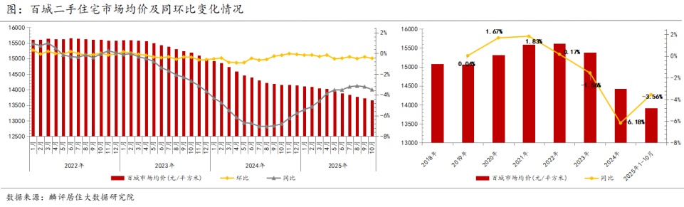 麟评居住大数据研究院发布的报告显示,2025年10月100个重点城市二手住宅市场均价为13661元/平方米,环比下跌0.48%,同比下跌3.5%,环比跌幅较上月扩大0.14个百分点。
