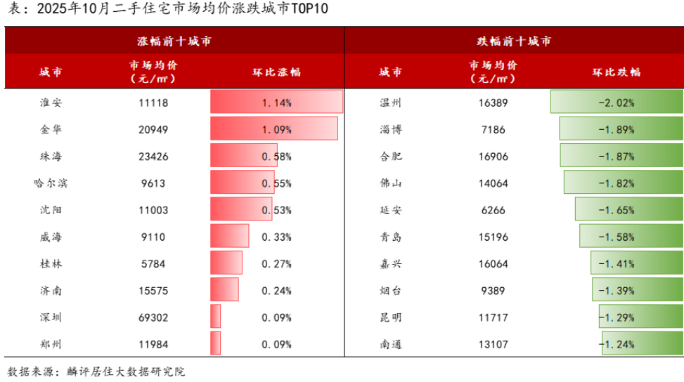 具体到城市,10月二手房价跌幅显著大于涨幅,市场整体承压。