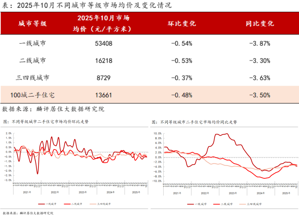 “银十”成交量环比季节性下降,百城二手房房价环比跌幅转扩,价格下行趋势未改。