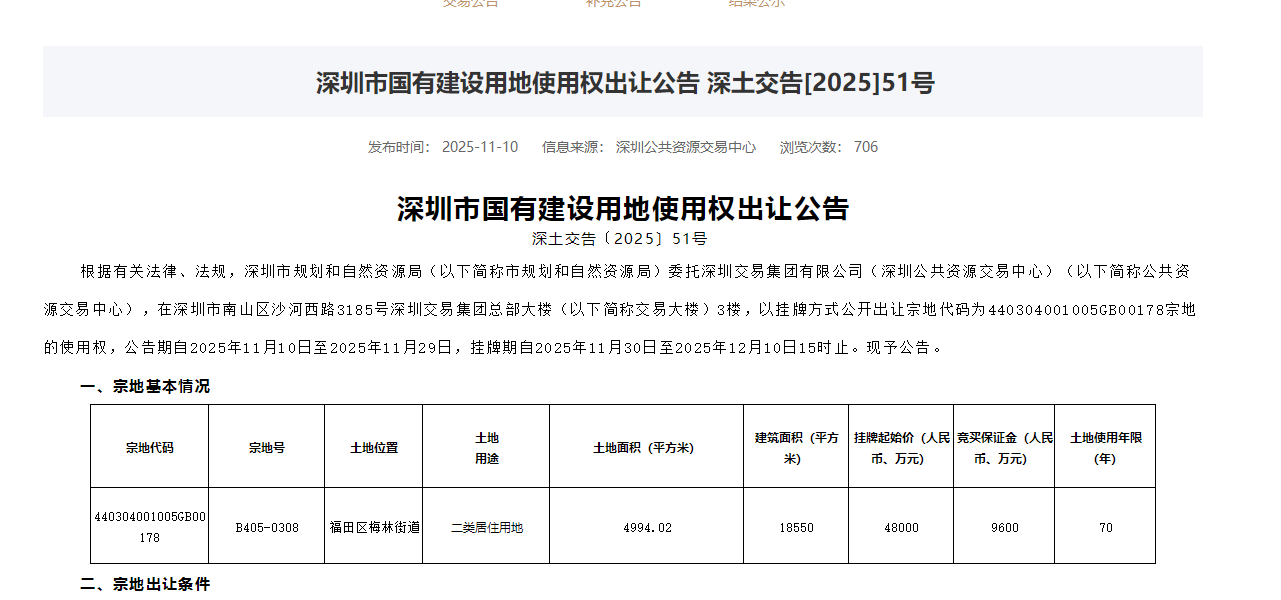 11月10日,从深圳市土地交易平台获悉,一宗位于福田区梅林街道的住宅用地(宗地号:B405-0308)已正式挂牌,起拍价4.8亿元,将于12月10日下午15时公开出让。