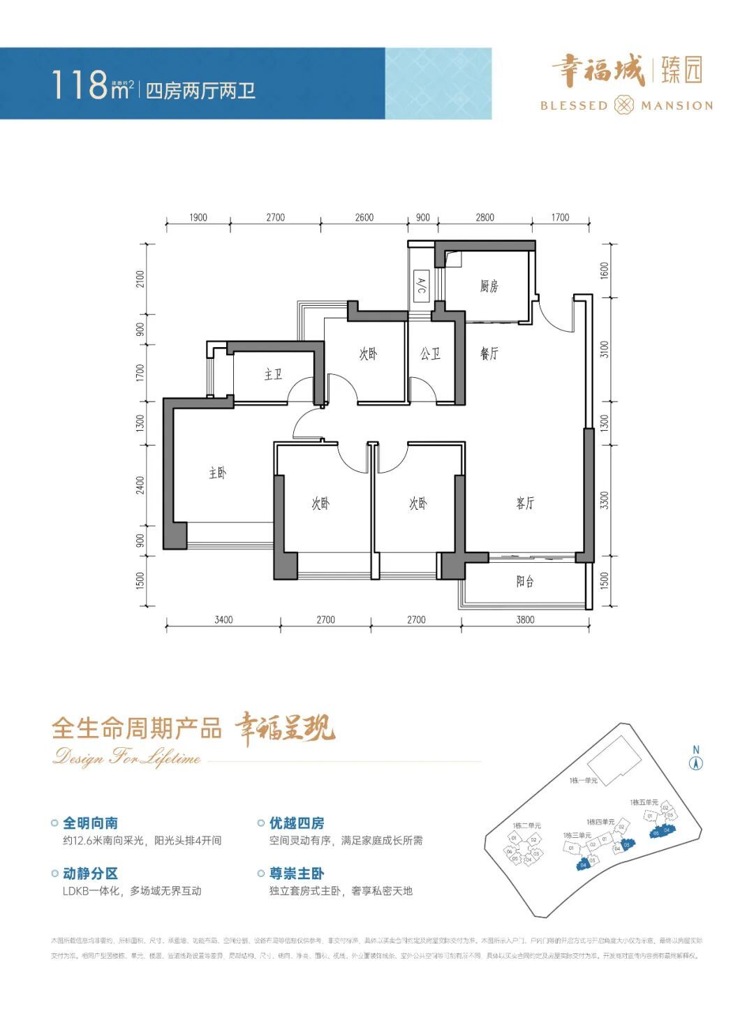 建面约118㎡优越四房,动静分区,约12.6米南向采光,打造阳光头排4开间;