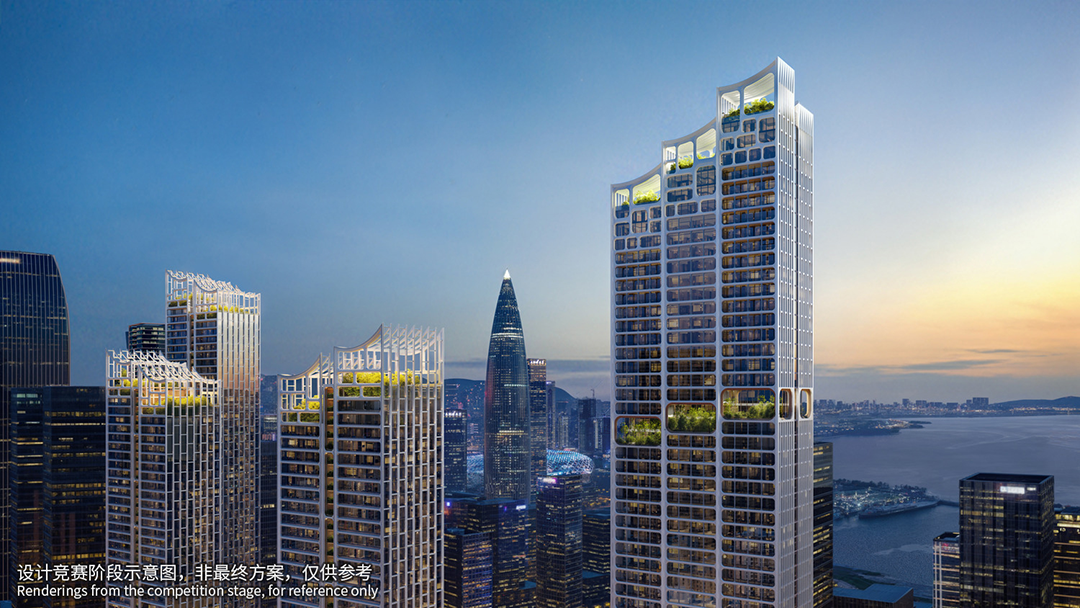 项目由五座150-250米塔楼组成,采用错落布局和平面退台设计,以优化深圳湾景观视野。