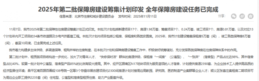 与此同时,2025 年第二批保障性住房建设筹集计划于 11 月 7 日正式印发。本批计划包含新建项目 17 个、房源 1.98 万套,筹集项目 7 个、0.24 万套,竣工项目 7 个、房源 0.81 万套,还涉及 13 个计划年内开工项目的 34 条市政道路及水电气配套工程,项目类型涵盖公租房、保租房和各类安置房。