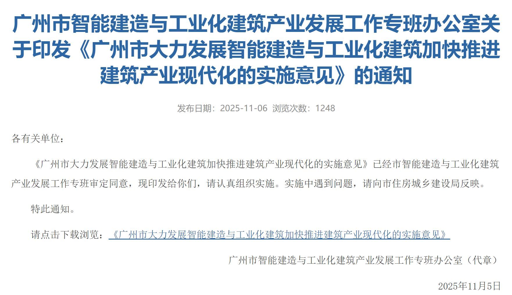 近日,广州市住建局网站发布消息,广州市智能建造与工业化建筑产业发展工作专班办公室印发《广州市大力发展智能建造与工业化建筑加快推进建筑产业现代化的实施意见》(以下简称“实施意见”)。其中提到,2026年起,广州市出让的居住用地100%实施装配式建筑。