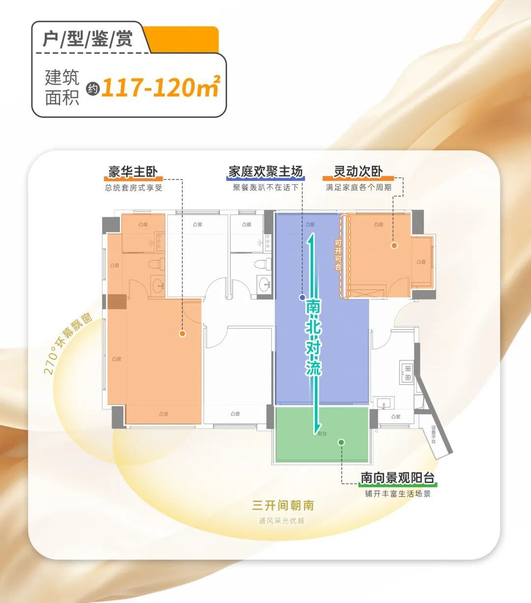 建面约117-120㎡奢阔四房,满足一步到位。三开间南向,本就拥有比其他项目更多的日照时长,南北通透的格局,又让室内通风采光进一步提升。