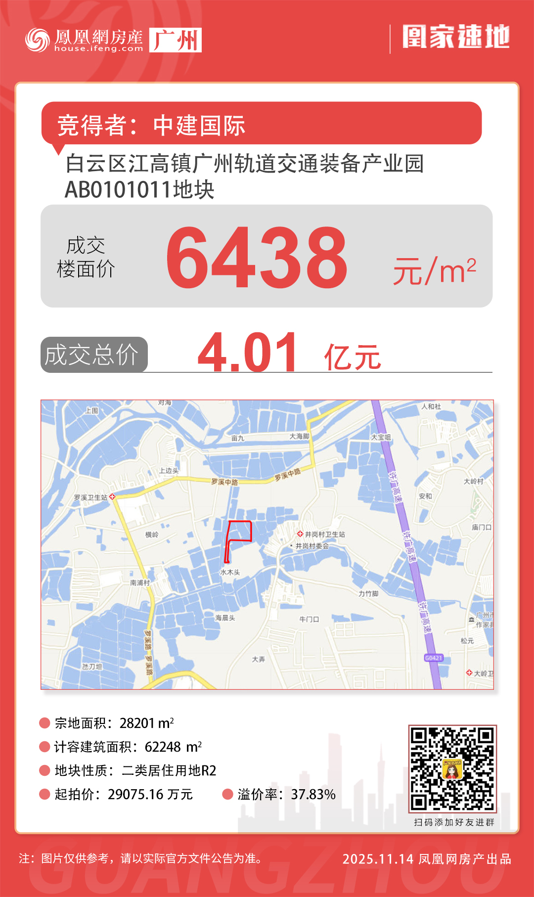 11月14日10时,白云区江高镇广州轨道交通装备产业园 AB0101011地块进行限时竞拍,经过22轮竞价,由广州海耀投资开发有限公司,归属中建国际,以总价4.01亿元竞得,溢价37.83%,折合楼面价为6438元/平。