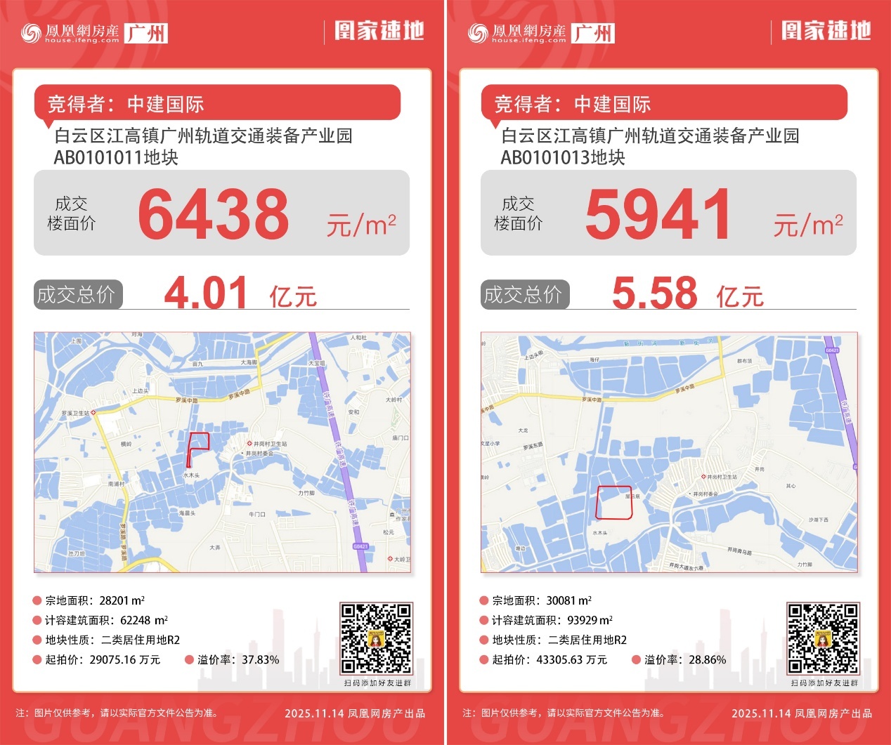 11月14日10时,白云区江高镇广州轨道交通装备产业园 AB0101011地块和AB0101013地块进行限时竞价,均由广州海耀投资开发有限公司,归属中建国际,分别以总价4.01亿元和5.58亿元竞得,合计出资9.59亿元,两宗地块竞价轮数分别为22轮和18轮,溢价率分别为37.83%和28.86%,折合楼面价分别为6438元/平和5941元/平。