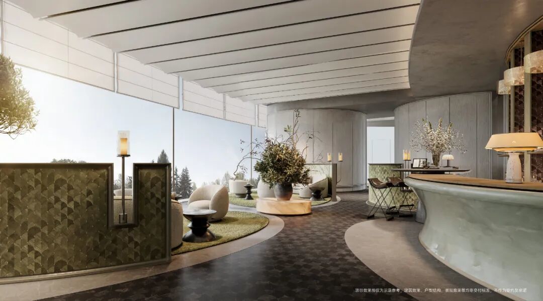 米色石材与金沙绿琉璃为主材精妙搭配,且融合屏风、折扇、云锦、琉璃等南京文化符号,呈现国际东方的归家美学。