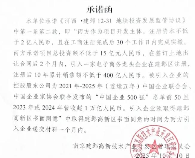 丙方作为项目开发主体,注册资本不低于2亿人民币且在工商注册完成后30个工作日内完成实缴。丙方承诺项目总投资额不低于15 亿元人民币,在签订土地出让合同后2个月内,引入一家电子商务龙头企业在建邺区注册,注册后10年累计销售额不低于400亿人民币。被引入企业的控股股东公司为2021年-2025年(连续五年)中国企业联合会、中国企业家协会联合发布的“中国企业500强”名单前50且2023年或2024年营收超1万亿人民币。引入企业须取得建邺高新区书面同意。