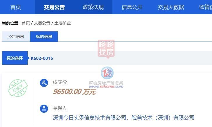 该地块由深圳今日头条信息技术有限公司,脸萌技术(深圳)有限公司以起始价9.65亿竞得。