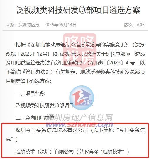 该遴选方案已经于5月公示,意向用地单位为深圳今日头条信息技术有限公司、脸萌技术(深圳)有限公司。