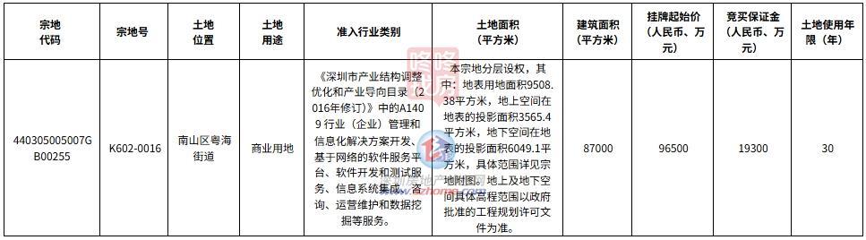 建筑面积87000平方米,挂牌起始价96500万元,土地使用年限30年。准入行业类别《深圳市产业结构调整优化和产业导向目录(2016年修订)》中的A1409 行业(企业)管理和信息化解决方案开发、基于网络的软件服务平台、软件开发和测试服务、信息系统集成、咨询、运营维护和数据挖掘等服务。