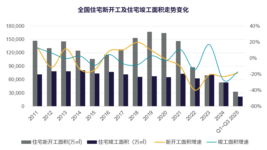 前三季度,全国住宅竣工面积22,229万平方米,较上年同期下降17.1%,降幅较上半年扩大了1.6个百分点。回顾历史数据,2011年至2023年的十三年中,全国住宅年竣工面积都稳定在6亿平方米以上的水平,但从2024年开始,住宅竣工面积有了明显的减少且趋势仍在延续,预计2025全年住宅竣工面积将较上年继续较大幅度下降。