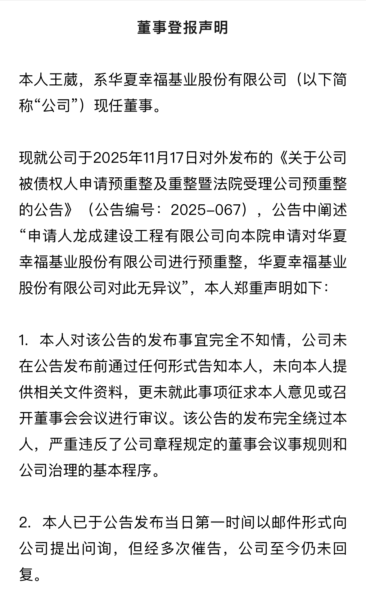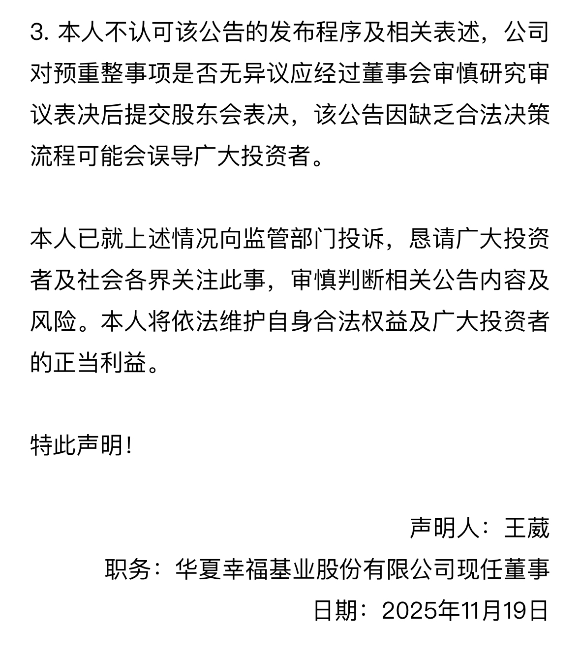 对此,11月19日,华夏幸福基业股份有限公司现任董事王葳公开发表声明提出异议,称其对该公告的发布事宜完全不知情,公告严重违反了公司章程规定的董事会议事规则和公司治理的基本程序。王葳称,华夏幸福对预重整事项是否无异议应经过董事会审慎研究审议表决后提交股东会表决,她已就上述情况向监管部门投诉,并提醒广大投资者及社会各界审慎判断相关公告内容及风险。