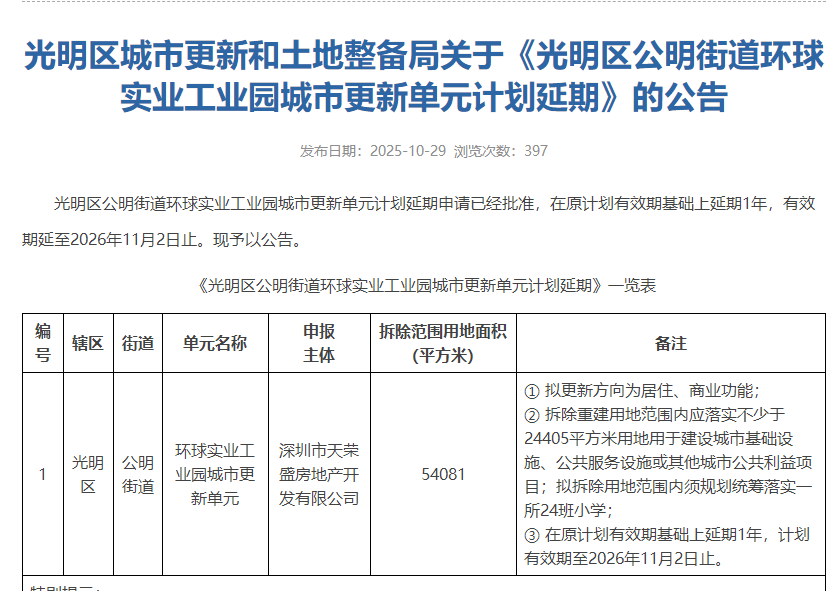 此前光明区公明街道环球实业工业园城市更新单元已申请延期一年,上次延期至2025年11月2日止,此次延期一年后,项目有效期将延至2026年11月2日。
