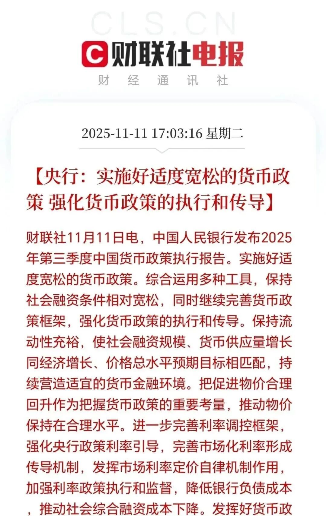 11月11日,央行再发话:实施好适度宽松的货币政策。