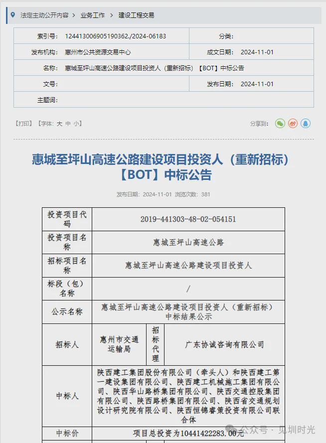 惠城至坪山高速公路项目已于2024年11月由惠州市公共资源交易中心发布BOT建设项目中标公告。