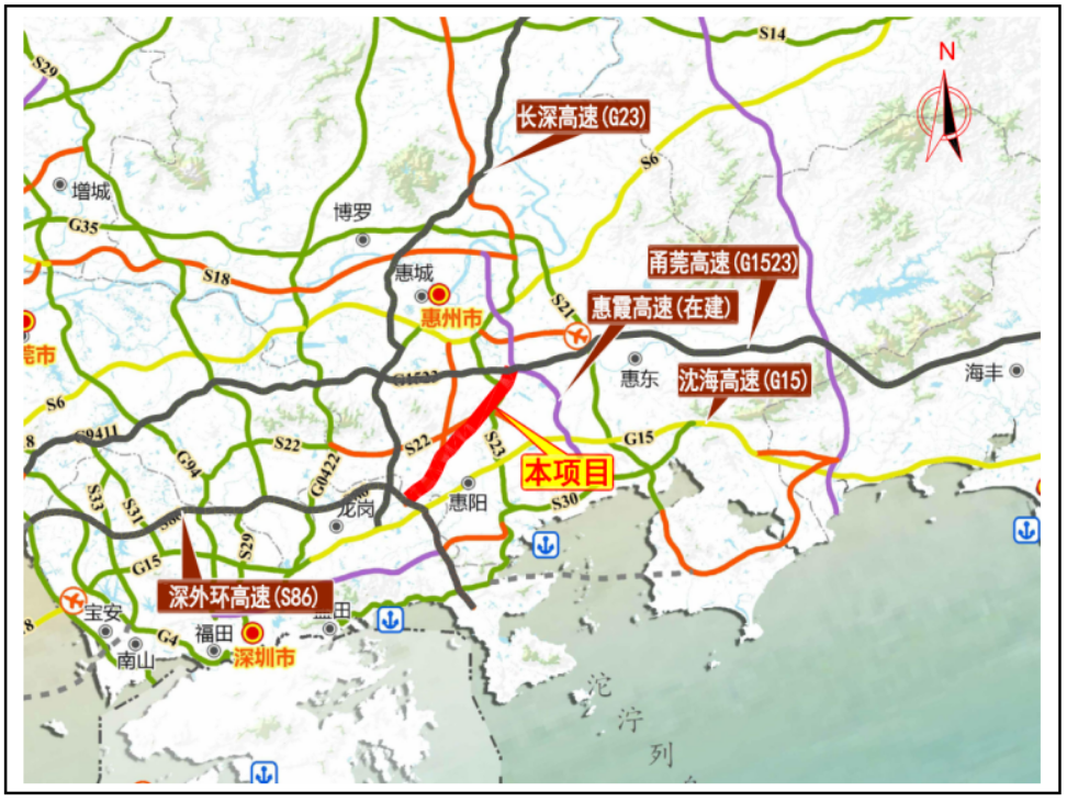 惠城至坪山高速公路(以下简称“惠坪高速”)为广东省2023年重点建设项目,该项目起于惠州市惠阳区永湖镇良湖立交与惠霞高速公路相接,途经惠阳区三和街道、秋长街道,终于深圳市龙岗区坪地街道,与深圳外环高速公路相接。