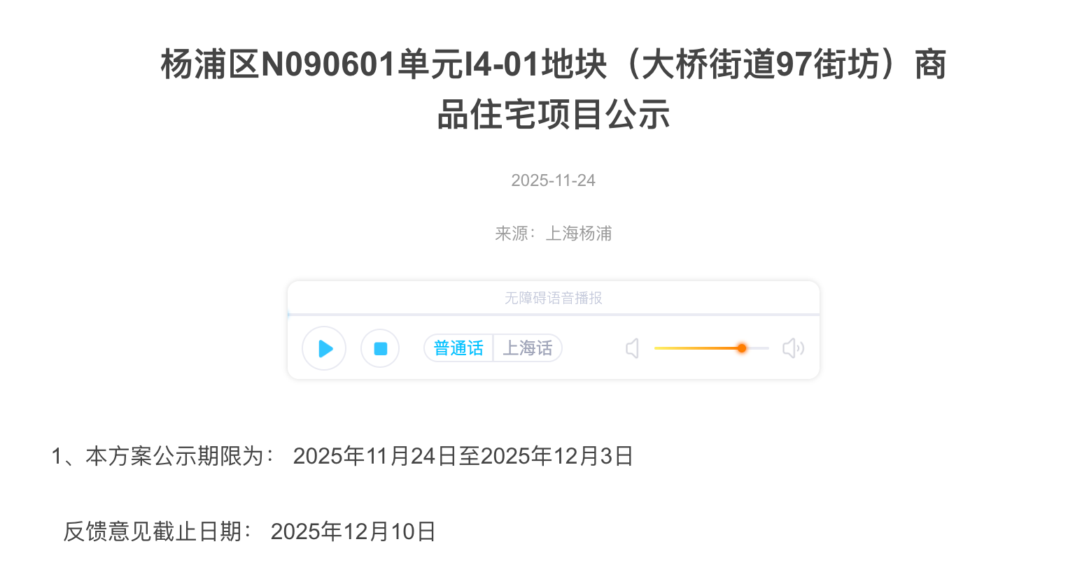 11月24日,杨浦区N090601单元I4-01地块(大桥街道97街坊)商品住宅项目——即中铁置业杨浦滨江项目,正式公示设计方案。